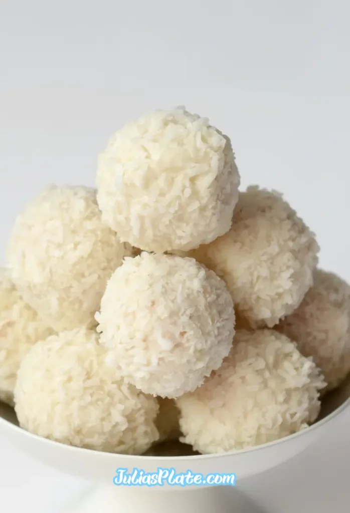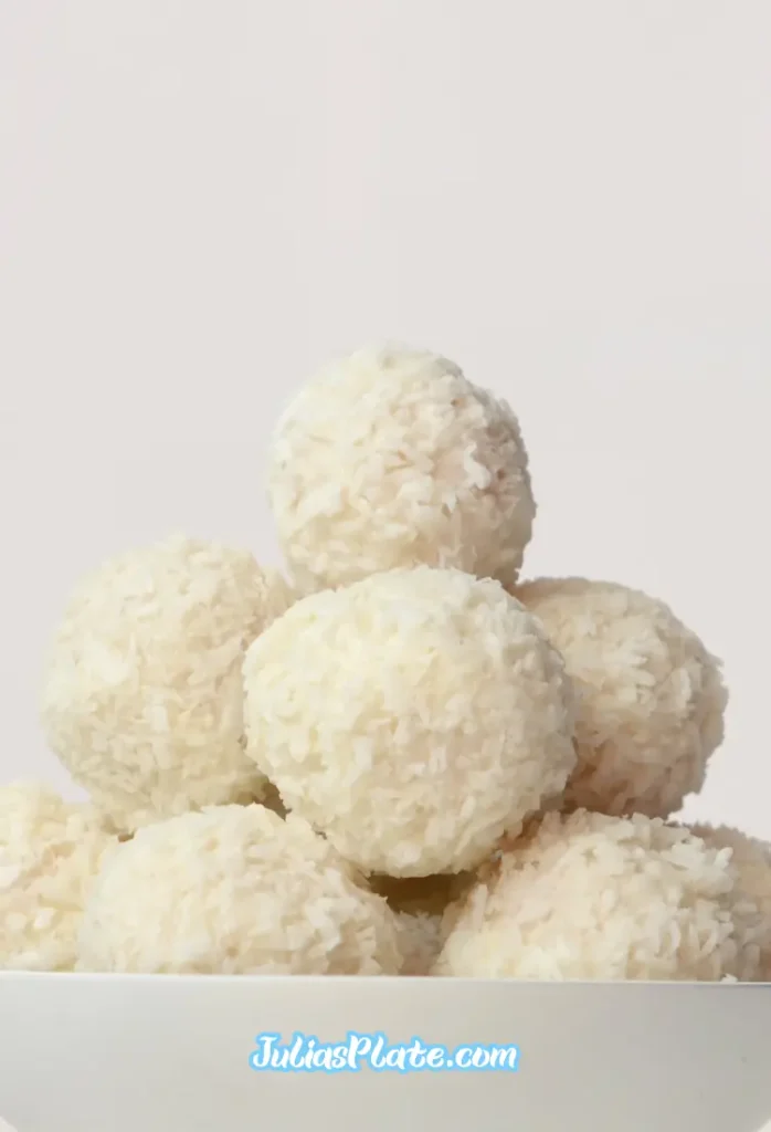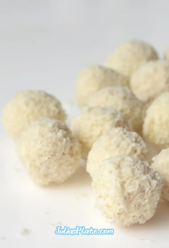 First and foremost, The delicious taste for sure, A small balls with coconut dough inside and covered with white chocolate, The combination of sweet coconut, creamy condensed milk, and rich white chocolate creates a great taste balls with so many flavors inside, Additionally, these truffles are so easy to make, requiring just a few simple ingredients and minimal prep time. Plus, they’re versatile, you can enjoy them on their own or dress them up with toppings like chopped nuts or cocoa powder.